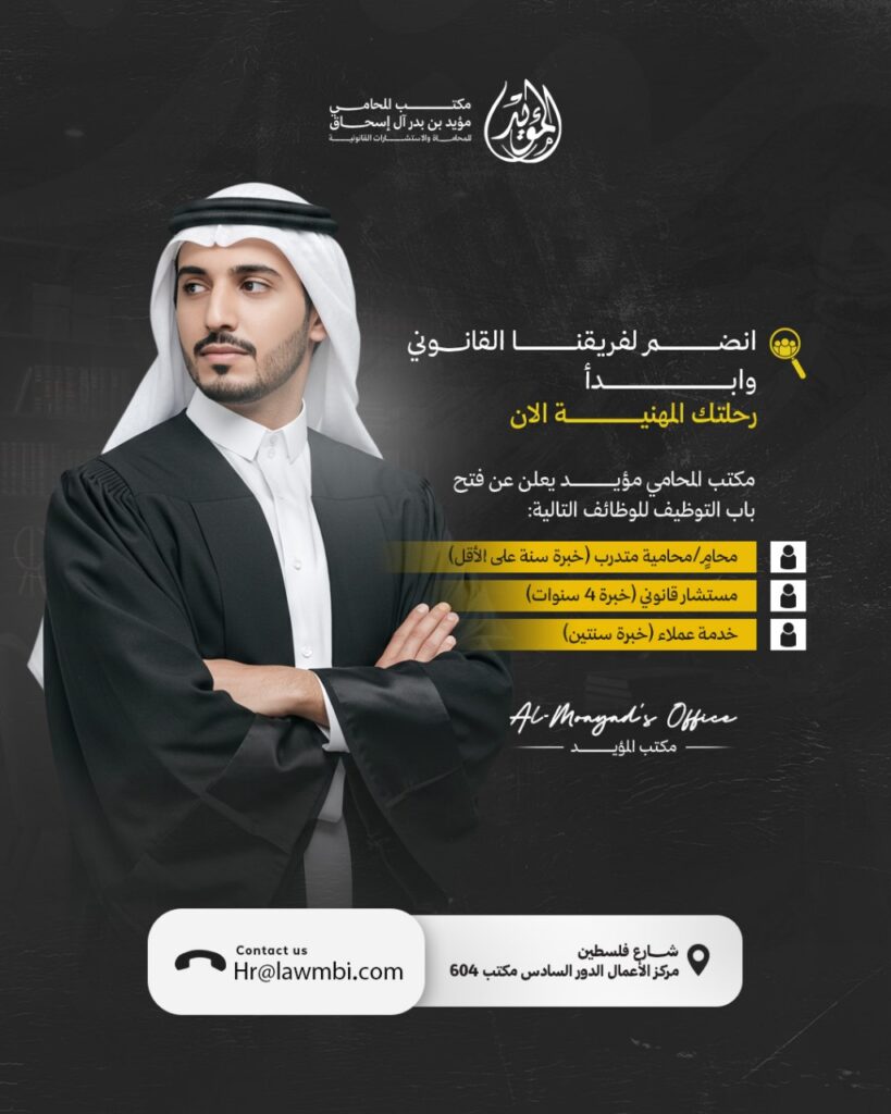 في شركة المحامي مؤيد بدر آل إسحاق للمحاماة والاستشارات القانونية، نؤمن أن النجاح القانوني يتحقق بالعمل الجماعي، الشغف، والإبداع القانوني. فريقنا يجمع نخبة من المحامين والمستشارين القانونيين في السعودية، جميعهم يتشاركون الالتزام بقيم العدالة، المهنية، وتقديم الحلول القانونية المبتكرة.